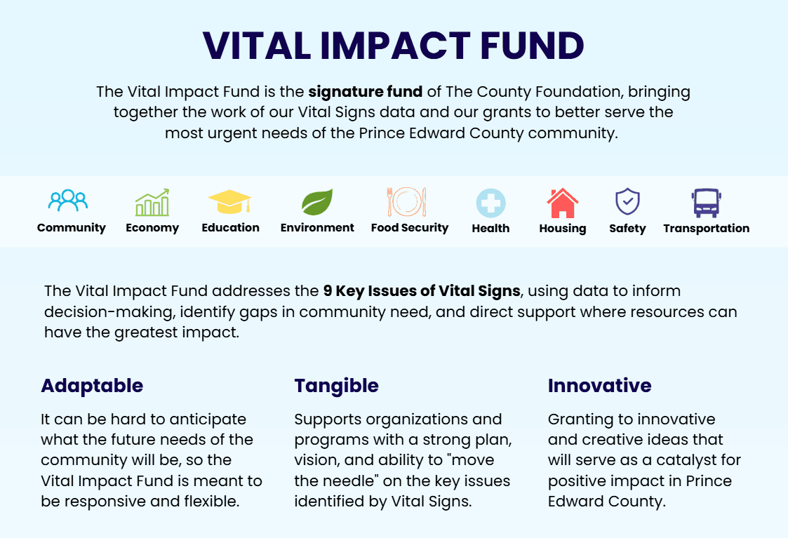 The Vital Impact Fund is the signature fund of The County Foundation (TCF), bringing together the work of our Vital Signs data and our grants to better serve the needs of the Prince Edward County community. This fund responds to Vital Signs priorities in our community granting to agencies and charitable organizations doing valuable work towards cross-sectoral priorities such as healthcare, food security, the environment and education.
