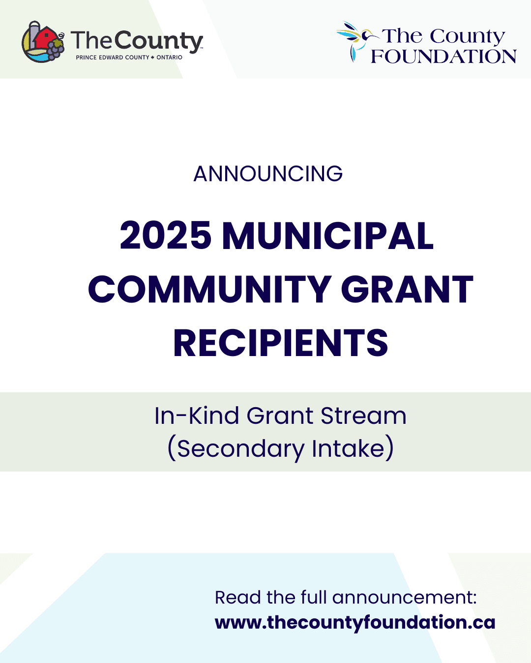 The Municipal Community Grants Program is made possible through funding from the County of Prince Edward and is administered by The County Foundation (TCF). The County Foundation works with an adjudication panel to determine which applicants receive the grants.